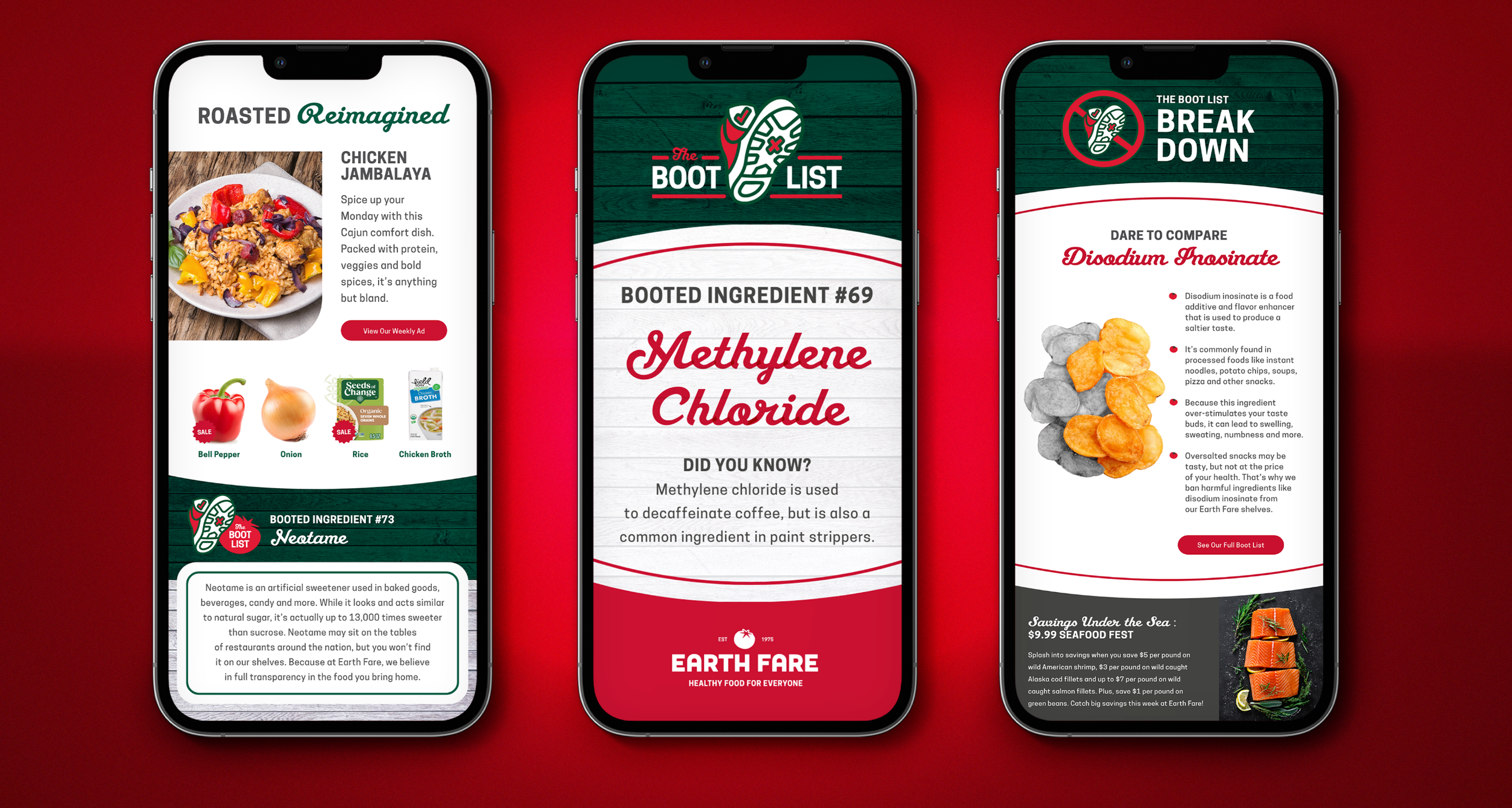 My team and I curated an email campaign that emphasized what sets Earth Fare apart from your average supermarket, being their lengthy list of banned ingredients rightfully dubbed as “The Boot List.”